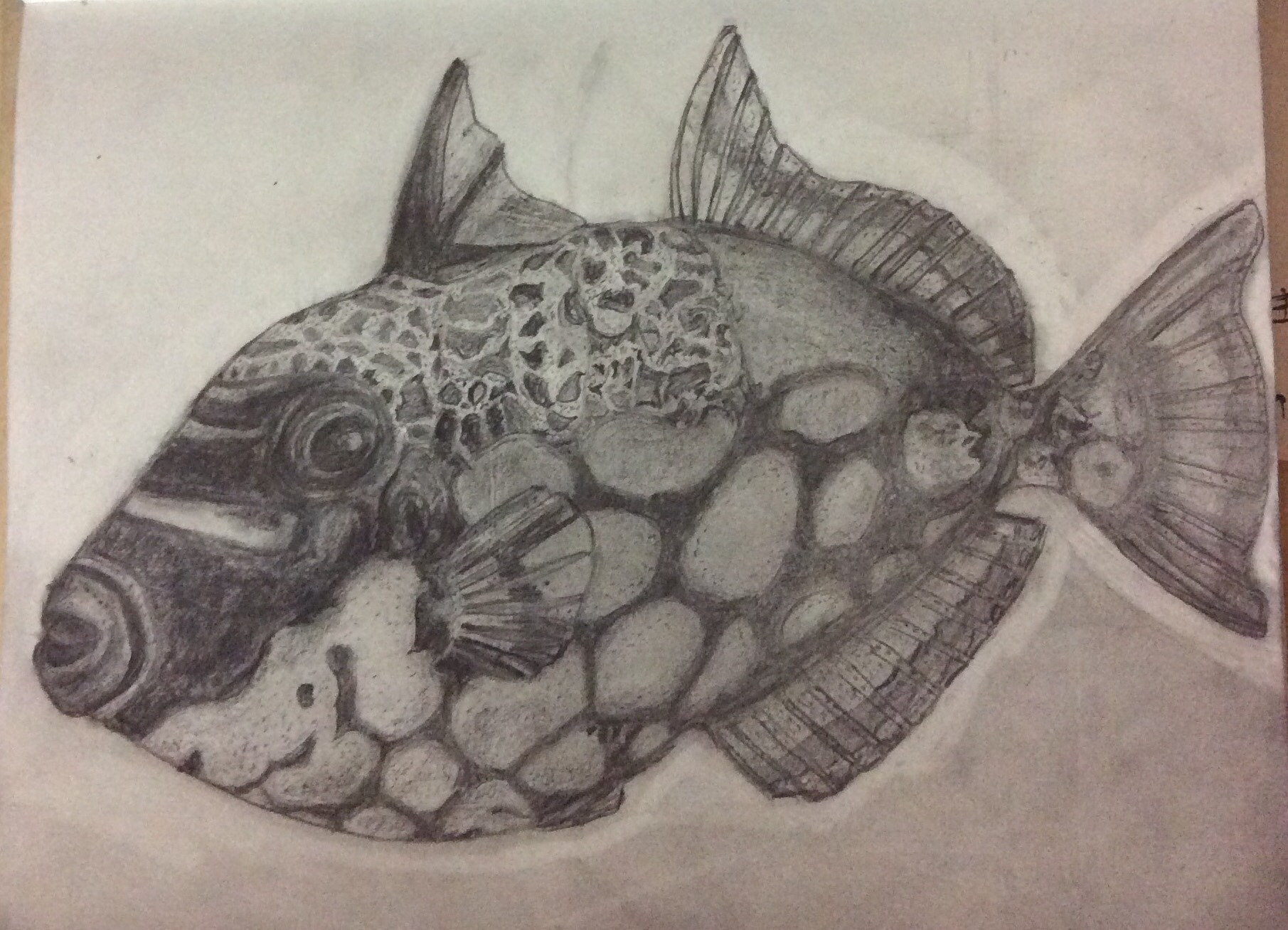 www.richard-seaman.comShop distraction was welcome, and helped me relax enough to draw that ellipse, or replicate the shape of the new poisson, my current subject cycle. Trigger fish, to be exact. This one is both more simple and more complex than last week’s, for it was a queen trigger fish, identifiable mostly by the little crown-like fin leading a secondary fin along the upper spine.  The model is unclear, and I know the iPad will find me lots of queen trigger fish when I return home to my internet access (like the one pictured here).