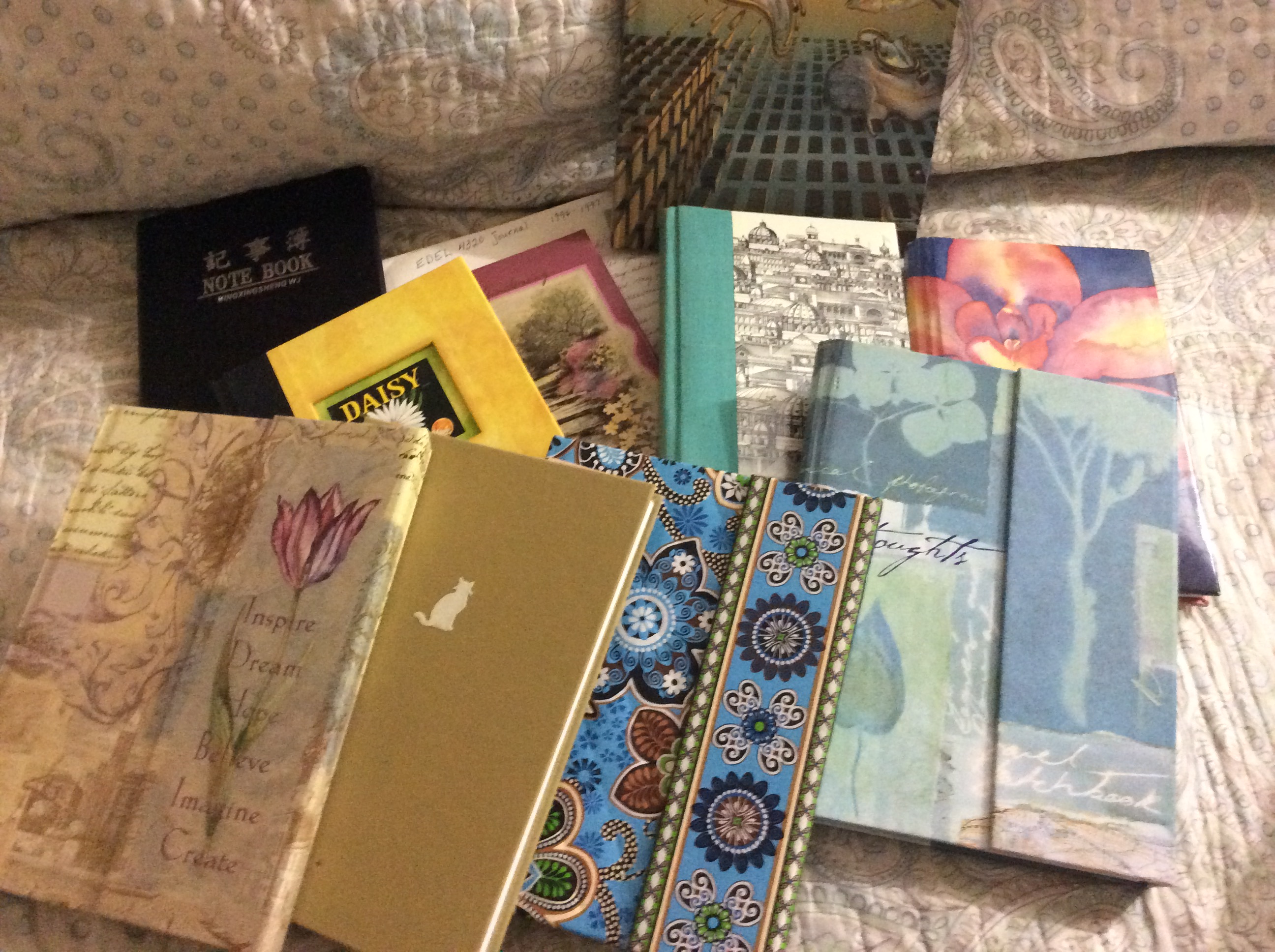 I’ve been journaling for years, and have gathered together the journals I have with me here on the island. There’s one more upstairs, by my bedside, but I’m reluctant to get it because my husband is sleeping, and the pets will all follow me up thinking I’m going to bed. That inevitably disturbs him, and he wakens rather grumpily from a sound sleep. For whatever reason, the dog and two kittens don’t go to the bedroom until I’m up there for the night. The dog (my husband’s dog) falls asleep on the sofa instead of heading up to bed with him. The kittens spend most of their time sleeping not far from the dog, but they do get up and play with their toys and each other for a while as the dog sleeps and can’t play Fun-Buster. But that’s a bit off the point. I don’t just blog–I also keep personal journals that I try to add to whenever I can still see straight so that I have some sort of record of my day (cataracts that need removal desperately). The journals are also where I keep information that and thoughts that are extremely sensitive or private. Sometimes I think I the reason why I write so much–either in a blog or in a journal–is because very little conversation takes place in my home except between me and the pets. If they’re willing to pretend to understand, I’m willing to pretend they hang on my every word. Everything else goes in blogs or journals. That’s not to say I lack for friends or company–I just don’t talk all that much. When things are in writing, I have something to fall back on, whether I’m right about what came out of my head, or to show myself that I’m wrong about what I said. Either way, it settles a lot of arguments…