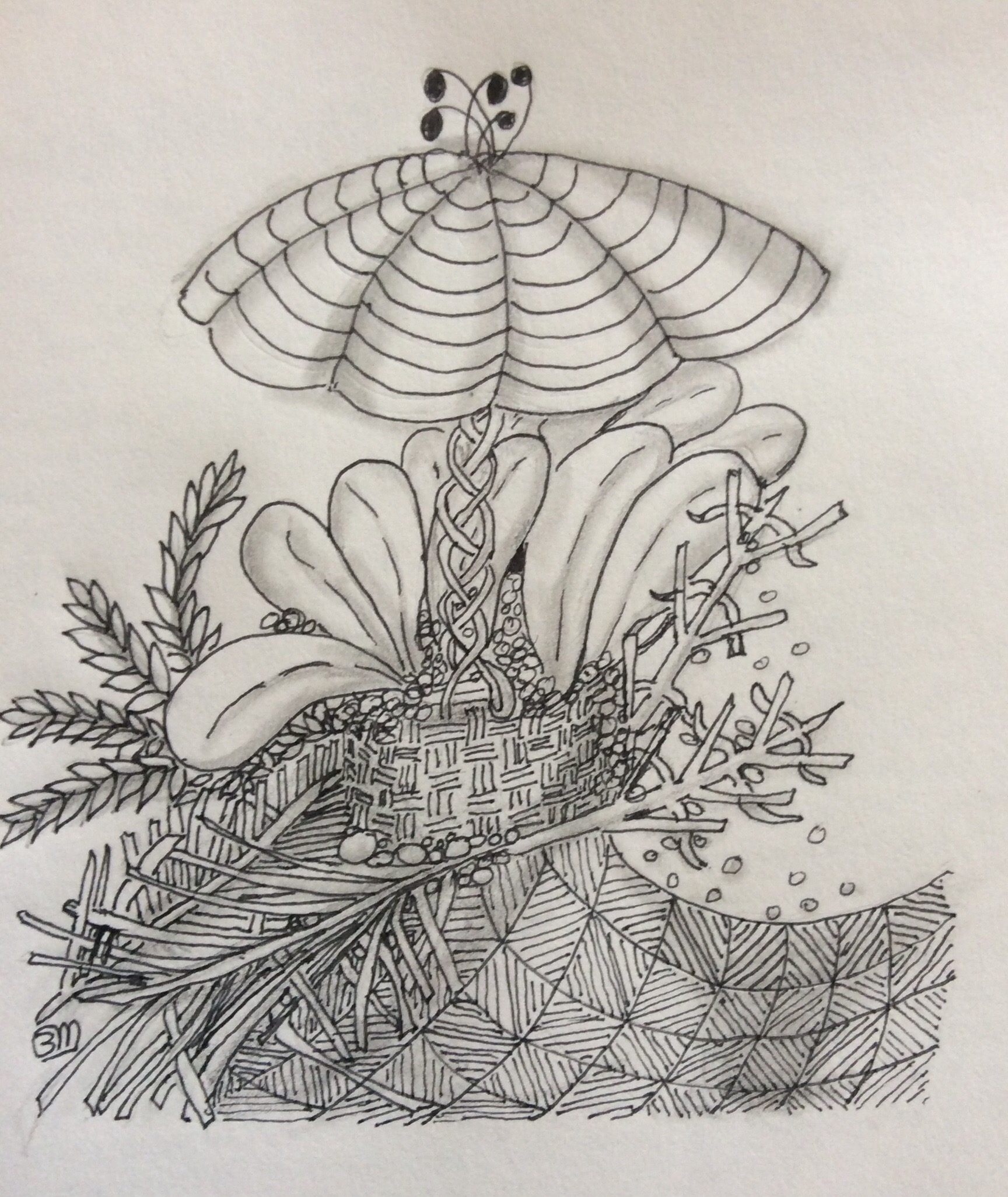 Today, it didn’t come out as well as the pencil drawing, but that was so light that even with bright daylight streaming into my living room I still could not trace properly. Worst of all, I lost my focus for shading, and erased several times before finally just letting it be. Not my best work, but infinitely less stressful than if I had produced it in ink from the start.
