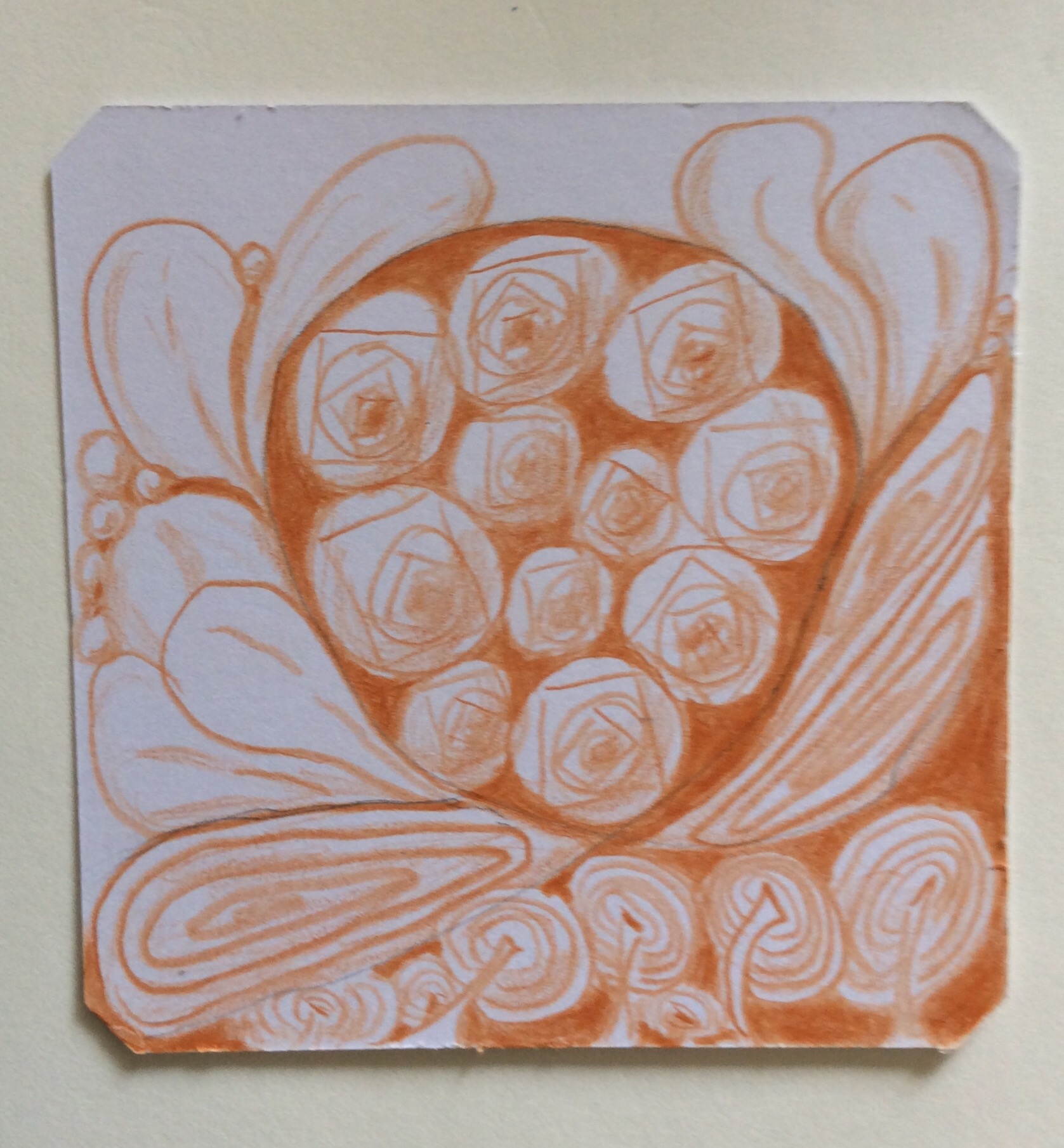 Last night, I was working on a Zentangle tile, but decided to use colored pencil instead of the Micron pen. I already knew erasure wouldn’t work well on the tile surface, but that was OK. Instead of using my Prismacolor Premier pencils, I grabbed the less expensive Prismacolor Scholar pack and set to work. I made two novice blunders right off: I drew my string (boundaries) using graphite pencil instead of the color pencil; and I didn’t sharpen the pencil soon enough. The graphite pencil lines seem to have been enhanced by the color pencil (terra cotta, if you’re interested). The pencil lines actually darkened considerably as I worked over them. Or maybe the terra cotta was darkened by the graphite, which is more likely. Either way, by the time I noticed what was going on, it was too late for erasure without destroying what I had already done. So, lesson learned #1: when using colored pencil, draw the strings lightly in the colors that will be used.