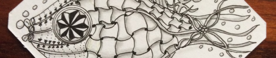 After botching up several attempts at Day 18 in One Zentangle a Day, I decided to change my perspective. So, I started by turning my tile 45 degrees. Instantly, I got an idea to do something a little different with Day 18’s tangle. Instead of a random string, I decided to start with a fish. Why a fish? Probably because I can’t draw frogs.