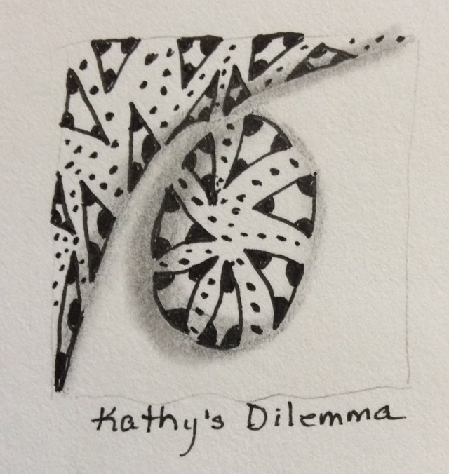 Moving right along in One Zentangle a Day, I am at Day 23. Today’s new Zentangle pattern is Kathy’s Dilemma. Instead of a second official or unofficial motif, a vine tangleation of Flux is introduced–except that I have been using this modification for some time.