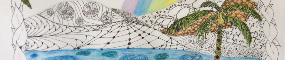My first obvious mistake was to fill in the area behind the palm on the right with Tipple. It looked OK in pencil and without being completely filled in. In ink and fully filled, the choice was obviously wrong. I had used two busy patterns (Tipple and Verdigogh), one on top of the other–not a good choice, especially since I was particularly fond of that tree. Maybe this mistake is so glaring to me because of how I felt about the tree. The second mistake was to use Nipa for the background hill on the left. And then there are the rainbow and umbrellas, both of which are too bright and primitive. And the starfish don’t recede. And the balance is off. And…