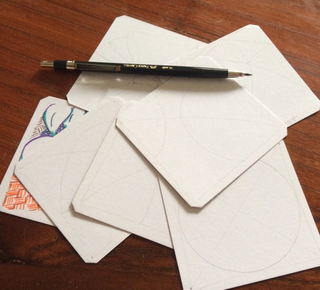 While I am “in the mood,” I thought I would pre-string a few Zentangle tiles. And maybe finally try out those brush pens I ordered. Break some rules for days when I can’t come up with anything to get me started.
