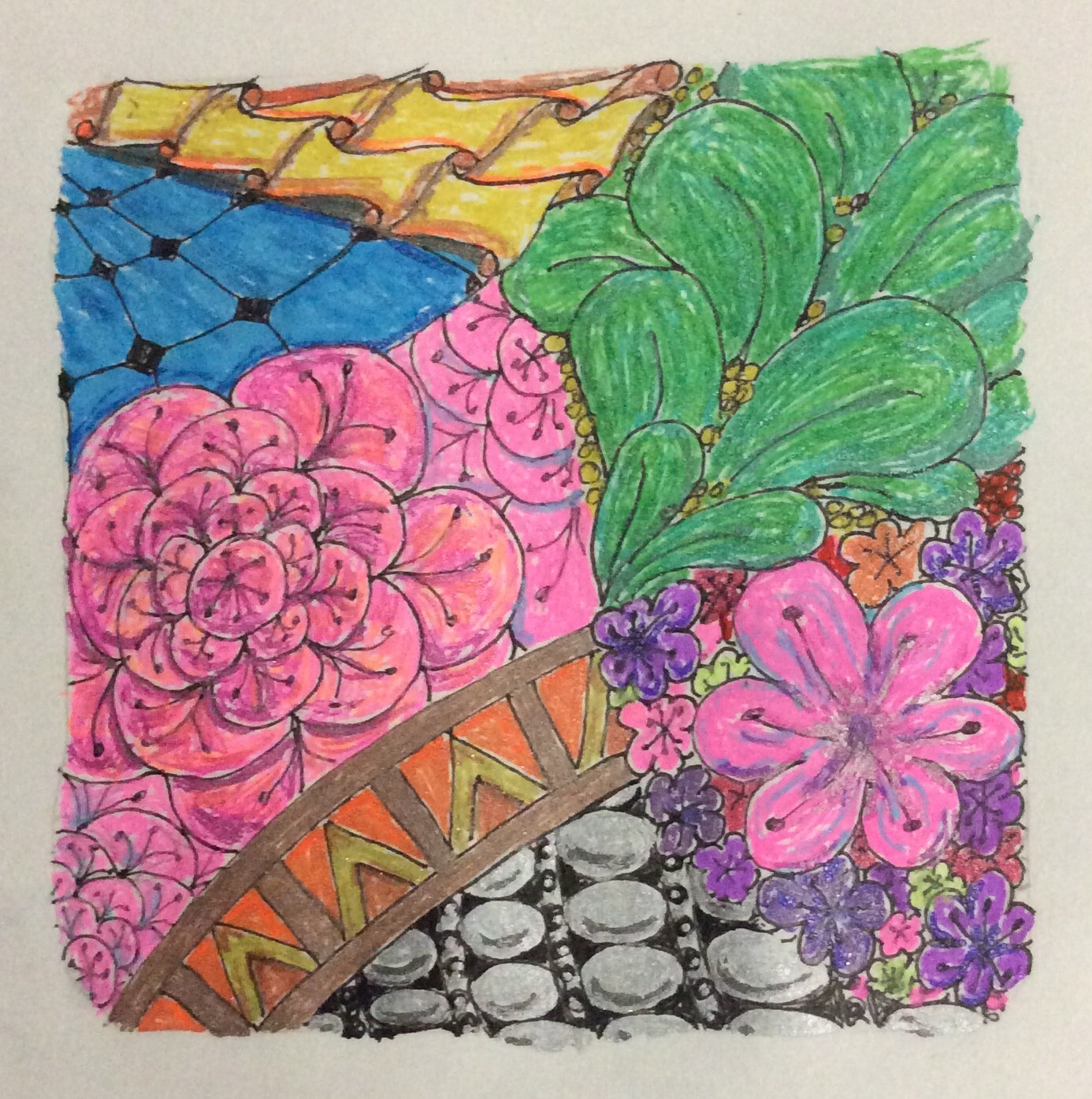 Last night, I laid out a design for a new tangle. Although I know better than to do any art  under electric lights, I was in the mood to experiment with coloring my creation with gel pens. It looked pretty good to me last night. When I broke it out today in natural light, however, all I saw was the terrible pen strokes and the garishness of the piece.