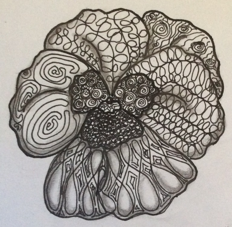So I drew what I call a “coloring book” drawing of a pansy on a artist tile. Next, I stared at it for several minutes, waiting for inspiration to come–which patterns to select for which part of the flower. Nothing. Zip. Nada, rien, nichevo. I reached for my box of mini-tiles and pulled about a dozen patterns that could be used for filling in spaces. The inner dark pseudo-leaves were easy enough to decide on–Printemps and the berries of the Bronx Cherry pattern are nice, dark, “small space” fillers. But the lighter outer leaves still made me pause for a while; because how could I use the full patterns and still maintain the fluttery dimensions of the petals? For the first petal, I chose wrongly, attempting to force Echoism into the envisioned curves–which of course did not work. The other petal patterns worked better, but I was already a bit frustrated by that first error, and I lost my concentration.