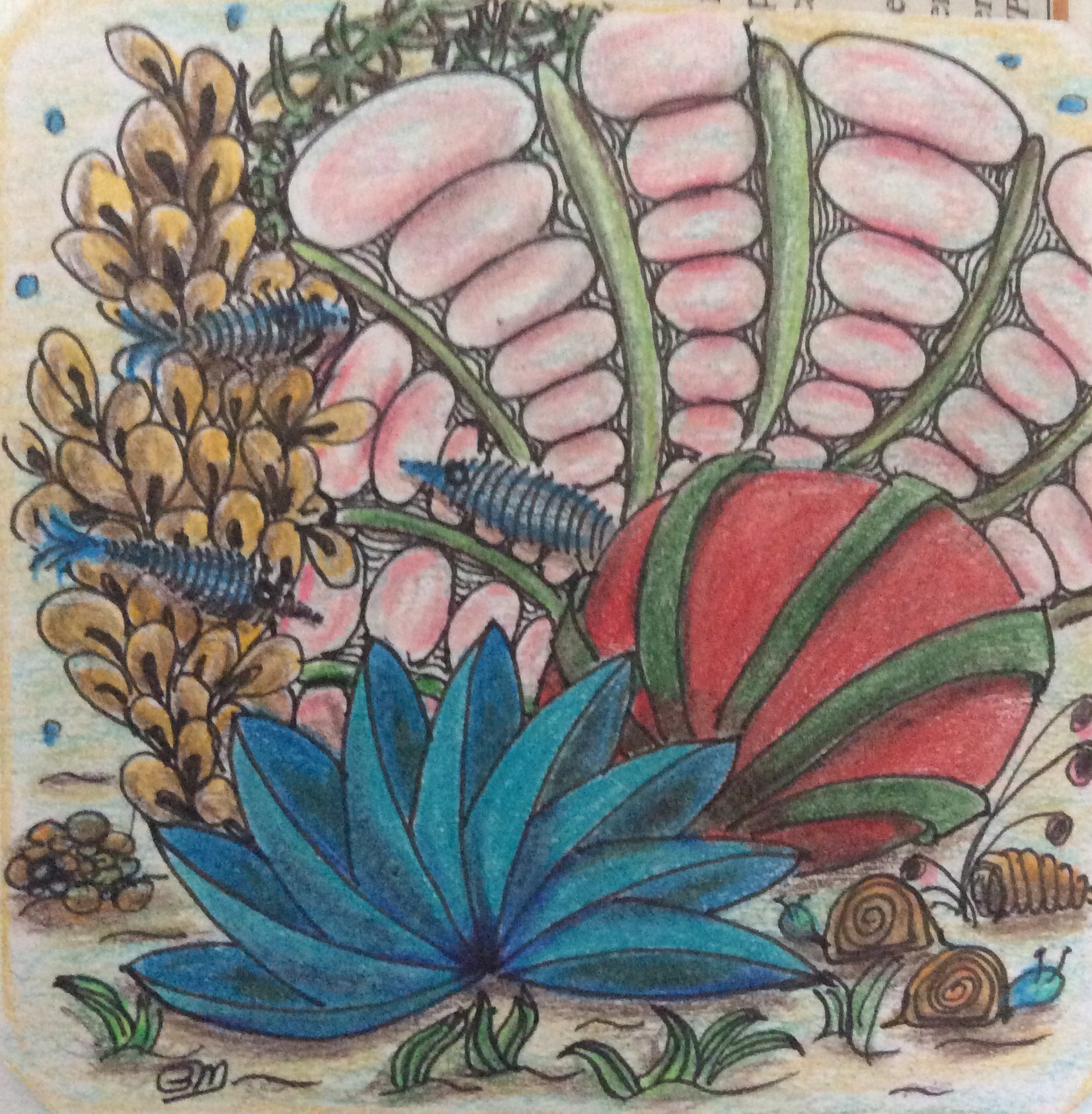 This tangle was done at night and with limited lighting.mit may not be my best effort, and it is certainly one of the few tangles to which I have added color, but it turned out reasonably well. It was inspired by clicking through many tangles that were uploaded to the site by both pros and talented amateurs (no, I don’t consider myself talented; hence, no uploads from me). Each day, I find that not only do I learn more patterns from viewing the tiles, but my “regular” art work is showing improvement by providing a new perspective on The use of the patterns for certain drawing techniques that I find difficult. And so, I continue to tangle.